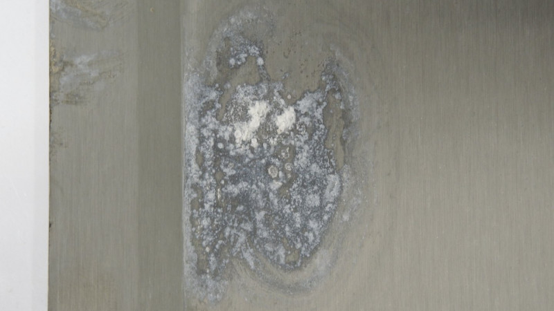 - Die Ursache der Ausblühungen ist ein Auftropfen von kupferhaltigem Lötwasser auf die Blechoberfläche und damit einhergehend ein ausgeprägter lokaler Angriff auf die Blechoberfläche unter Ausbildung von Weißrost.